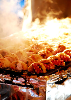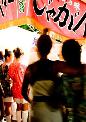 夕方になると民家エリアは屋台でいっぱいになります。 盆踊りの音楽と太鼓の音を聞きながら祭りの雰囲気をお楽しみください。